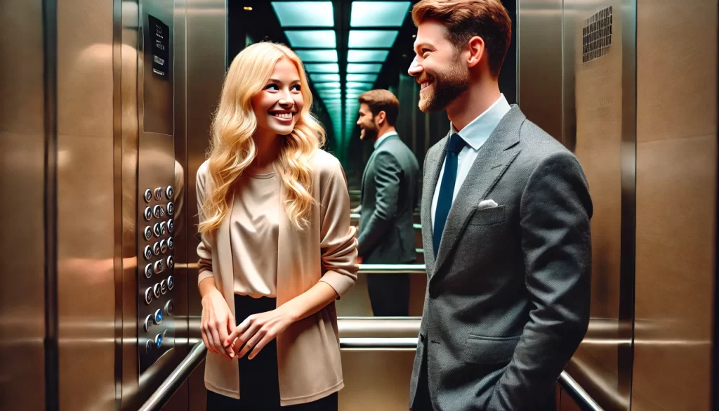 A Blonde is getting on an elevator and meets a gentleman onboard.