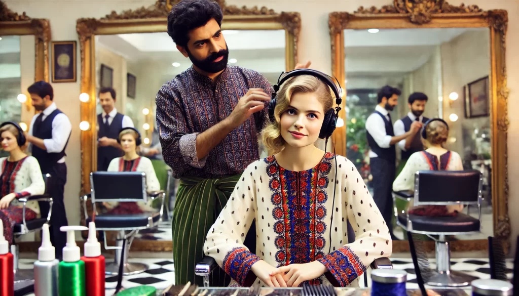 The hairdresser, shocked, then hears the headphones. It was repeating the words “Inhale… exhale…. inhale….. exhale….”