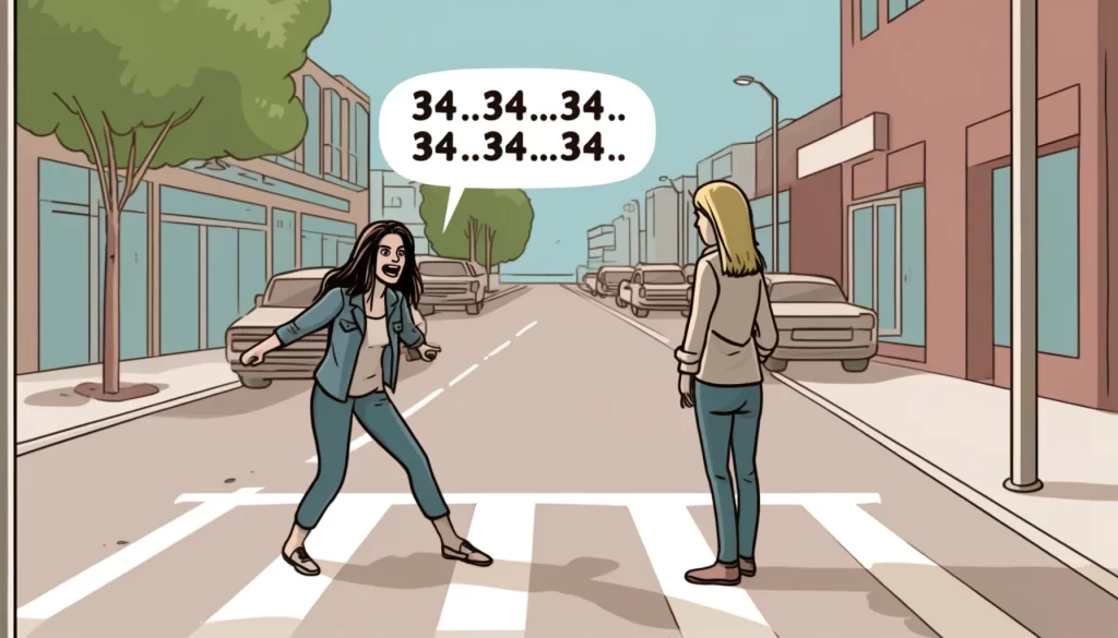 So the blonde walked down the street repeating “34…34…34…” when all of a sudden a car sped by and ran her over.