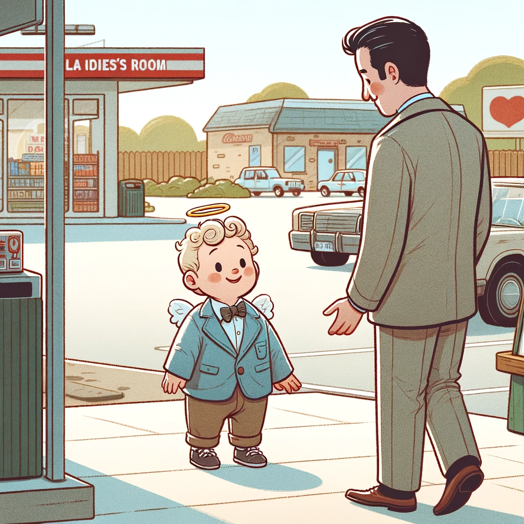 A delightful, angelic little boy Johnny was waiting for his mom outside the ladies’ room of the gas station: