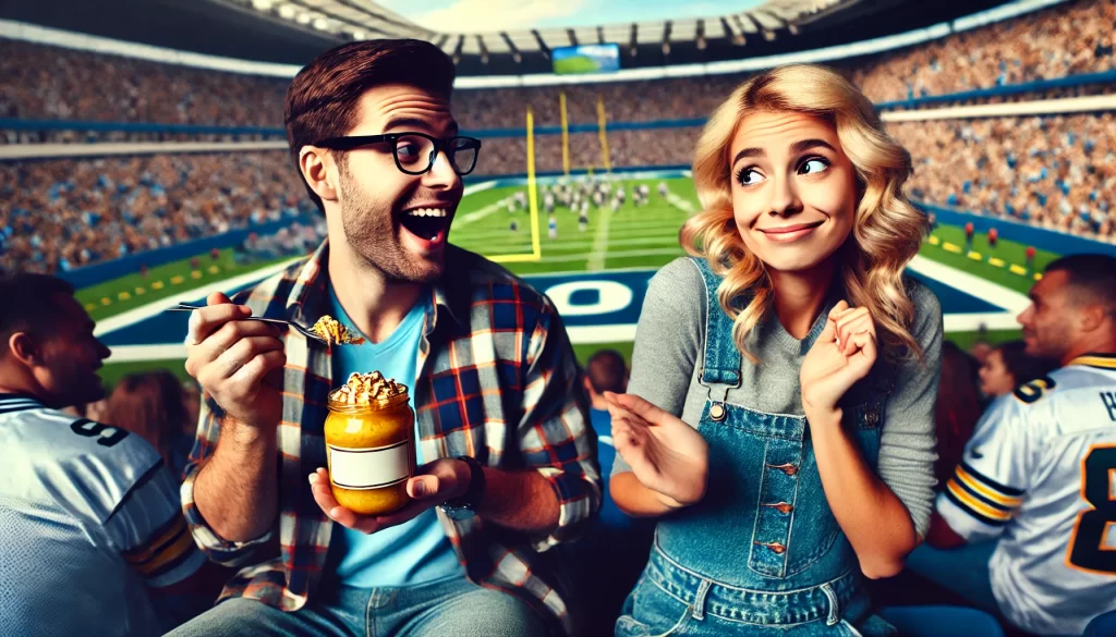 A guy took his blonde girlfriend to a football game for the first time.