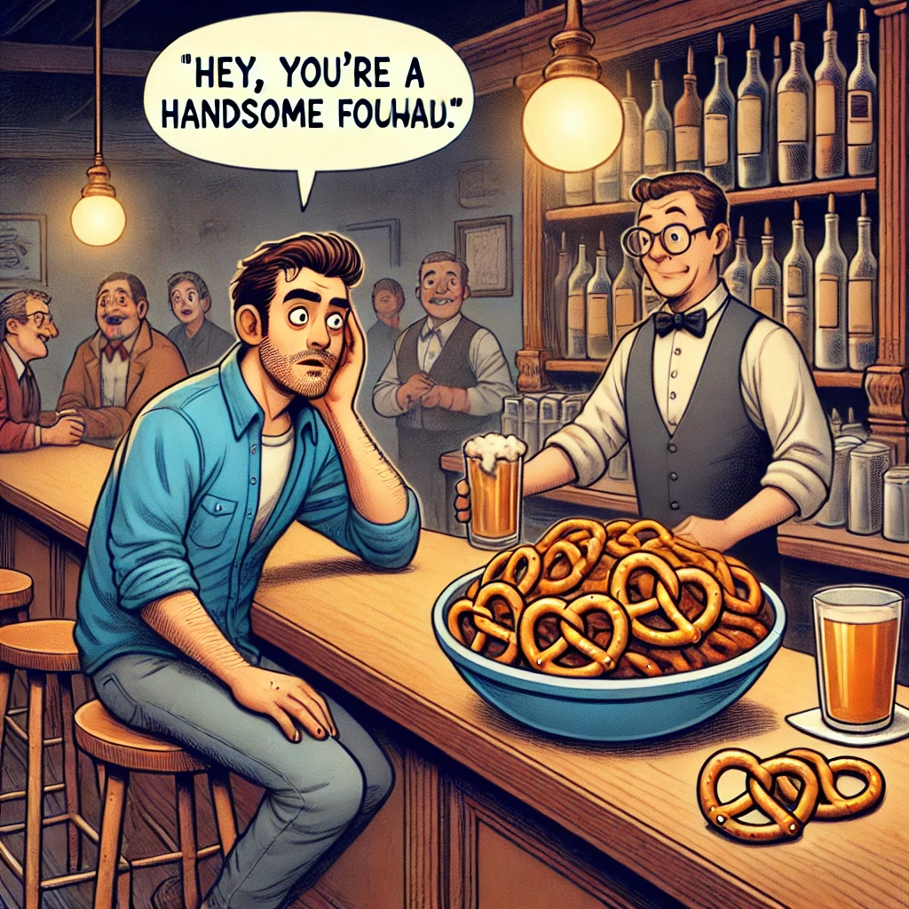 A guy walks into a bar and grabs a stool. Before he can order a drink, the bowl of pretzels on the bar in front of him says, “Hey, you’re a handsome fellow.”