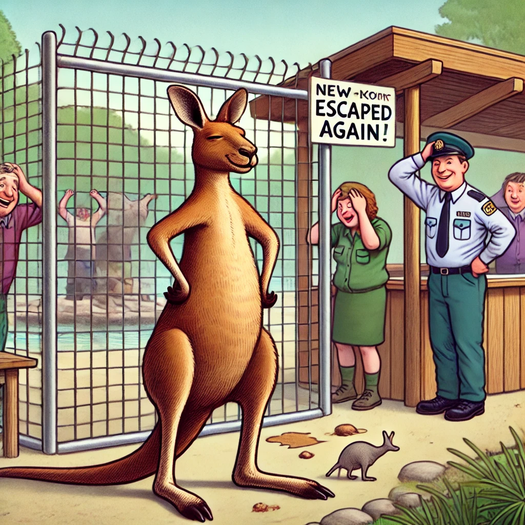 The kangaroo answers, “Not sure, but it still won’t matter, unless they remember to lock the door this time.”