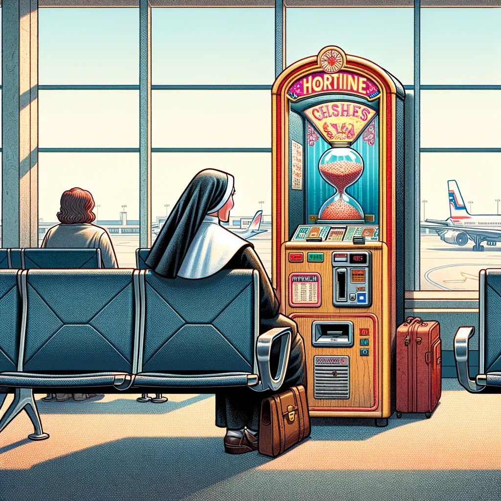 But getting down off the machine she slipped, and as she was straining to keep herself from falling to the floor, she broke wind. Absolutely stunned, she sat back down and looked at the machine. She said to herself, “This is truly remarkable. I’ve got to try this again.” She went back to the machine, put in another nickel, and another card came out. It read, “You are a Nun. You weigh 128 lbs. You have fiddled and farted around and missed your flight to Chicago.”