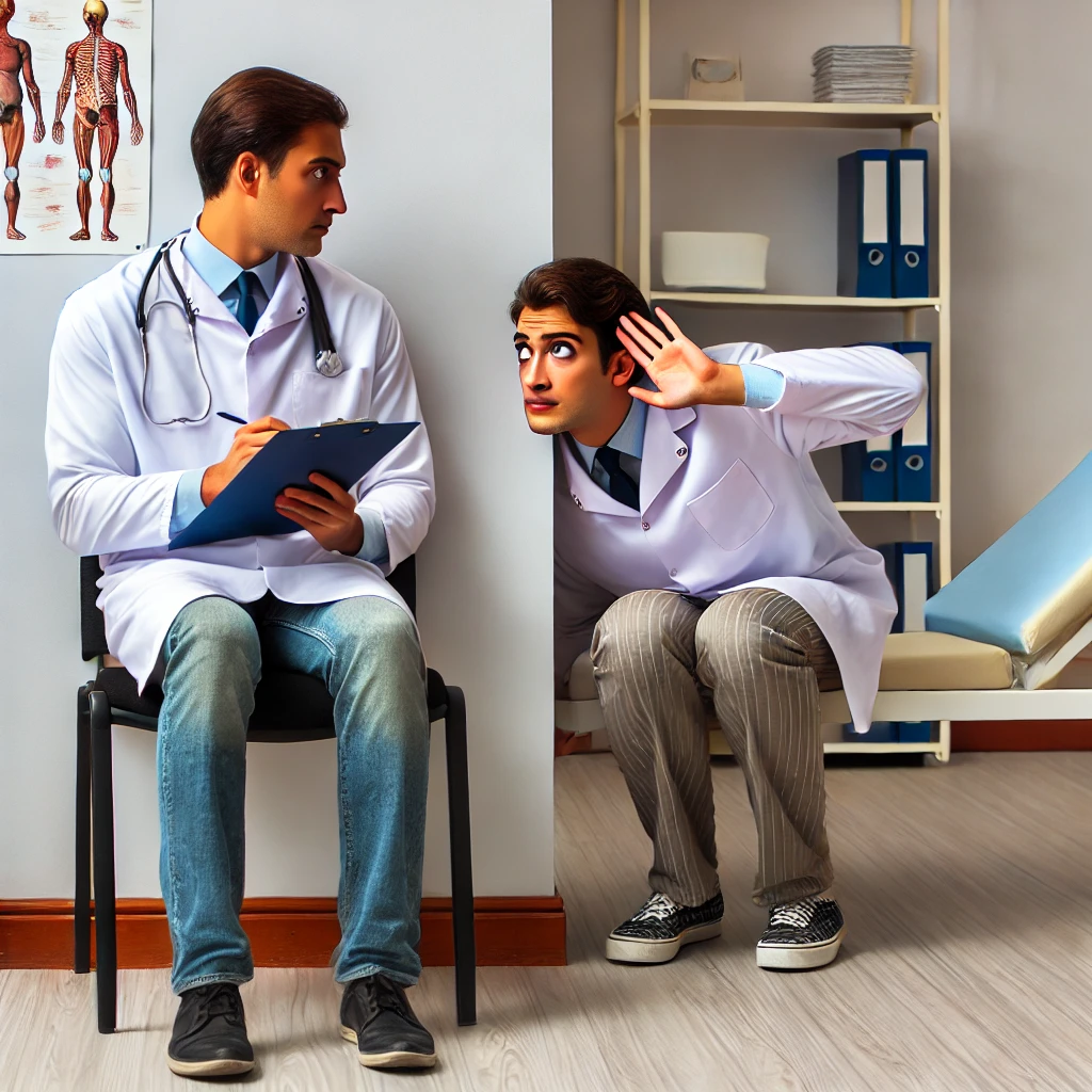 The doctor would watch this man, day after day, sit against the wall. The doctor finally decides to see what the patient is always listening to, so he puts his ear up to the wall and listens alongside the man. He hears nothing.