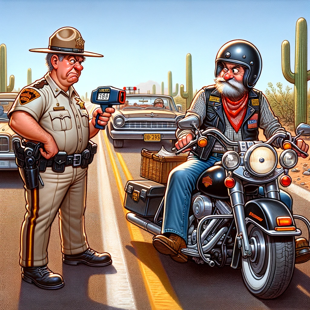 An Arizona Highway Patrol officer stops a Harley for traveling faster than the posted speed limit: