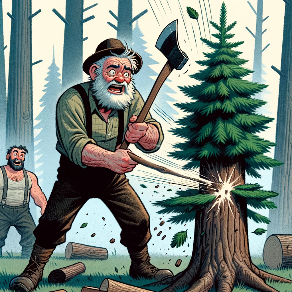 To prove this, he goes outside, hits a five-foot tree with his ax, and it falls over.