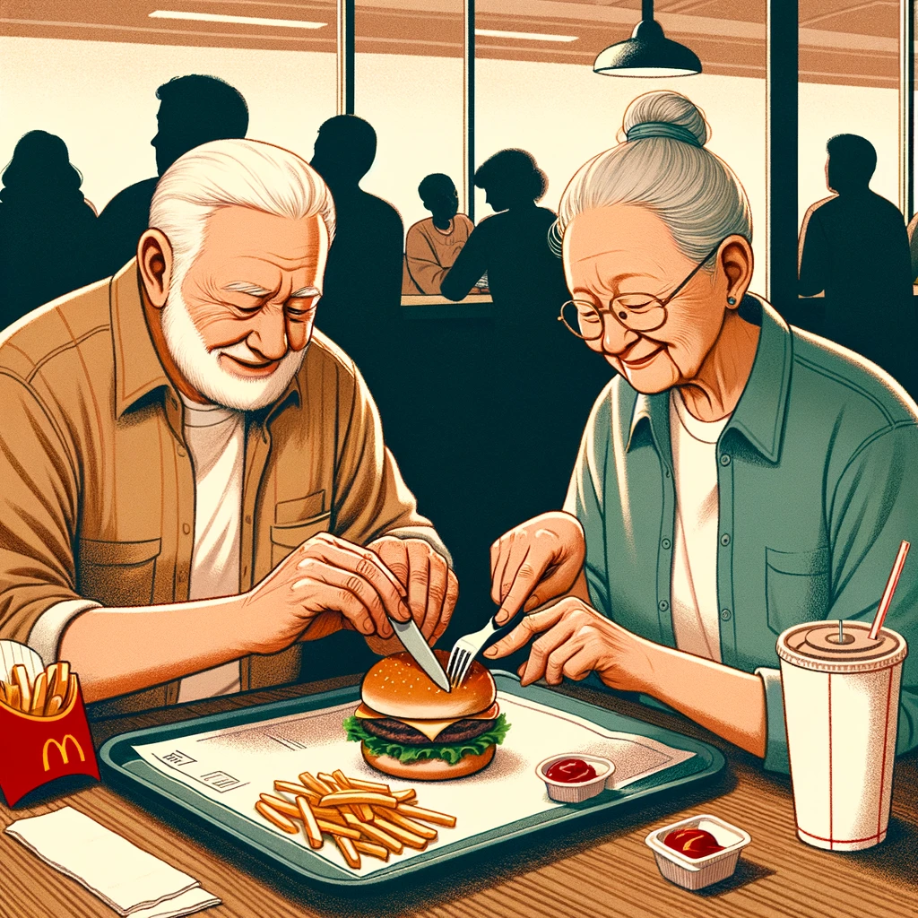 An old man placed an order for one hamburger, French fries, and a drink. He unwrapped the plain hamburger and carefully cut it in half, placing one half in front of his wife… He then carefully counted out the French fries, divided them into two piles, and neatly placed one pile in front of his wife. He took a sip of the drink, his wife took a sip, and then set the cup down between them.