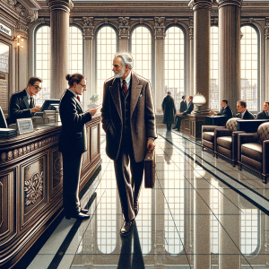 An elderly wealthy man walks into a bank in New York City