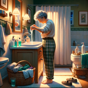 After putting her grandchildren to bed, a grandmother changed into old slacks and a droopy blouse and proceeded to wash her hair