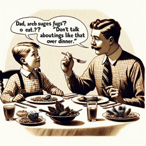 A boy asks his father, “Dad, are bugs good to eat?” “That’s disgusting. Don’t talk about things like that over dinner,” the dad replies. After dinner, the…
