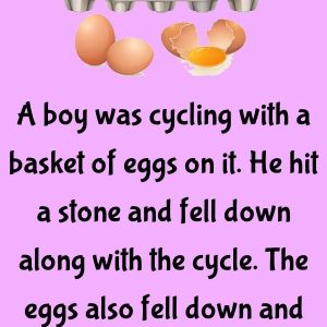 A boy was cycling with a basket of eggs on it. He hit a stone and fell down along with the cycle. The eggs also fell down…