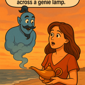 A woman was walking on the beach when she came across a genie lamp. She picked up the lamp, rubbed it, and lo and behold, a genie…