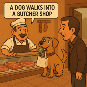A Dog Walks Into A Butcher Shop. The butcher asks, “What do you want?” The dog points to steak in a glass case. “How many pounds?” The…