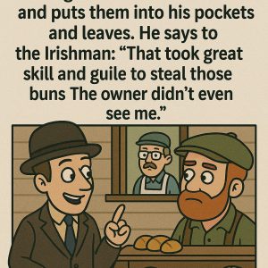 An Englishman and an Irishman go to a bakery. The Englishman steals three buns and puts them into his pockets and leaves. He says to the Irishman:…