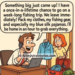A man calls home from the office and excitedly tells his wife, “Something big just came up! I have a once-in-a-lifetime chance to go on a week-long…