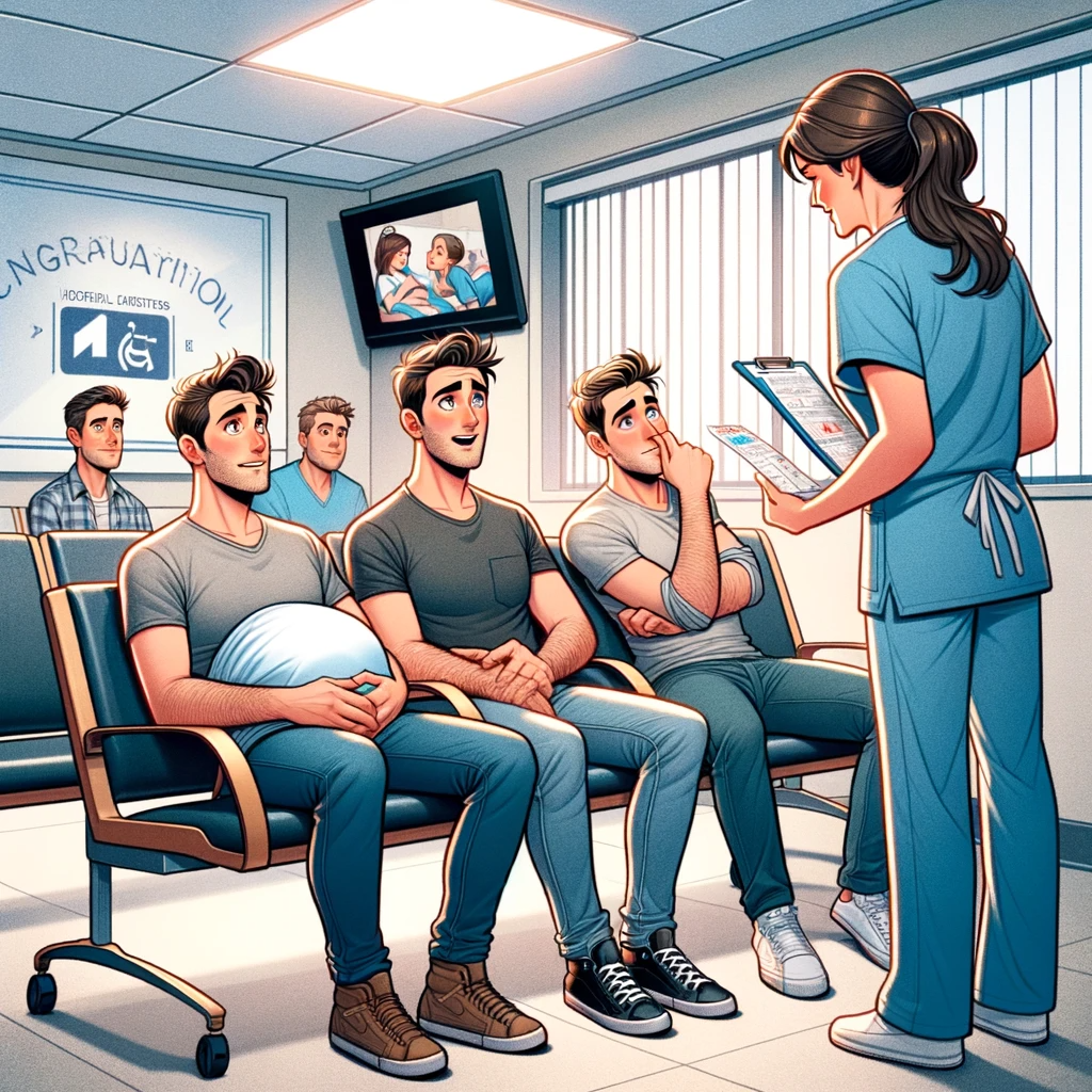 Four men are in the hospital waiting room because their wives are having babies.