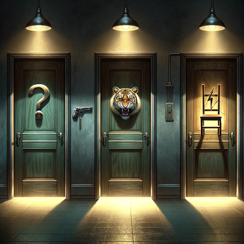 Q: If you were forced to go through one of the following doors, which door do you go through with 100 % certainty you’d stay alive: a door with a man with a gun behind it, a door with a tiger who hasn’t eaten in 7 years behind it, or a door with an electrical chair behind it?