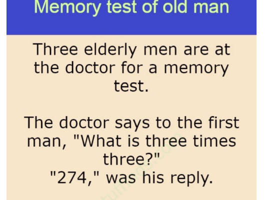 Memory test of old man Three elderly men are at the doctor for a memory test. The doctor says to the first man, “What is three times