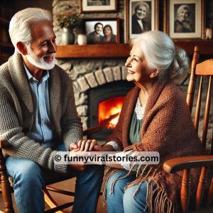 An old man and an old woman are sitting side by side in their rocking chairs. The old woman is quietly embroidering, and the old man is…
