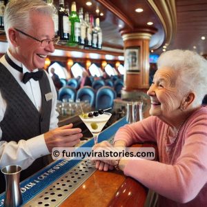 An elderly lady walks up to the bar on a cruise ship and orders a Scotch with just two drops of water. As the bartender hands her…