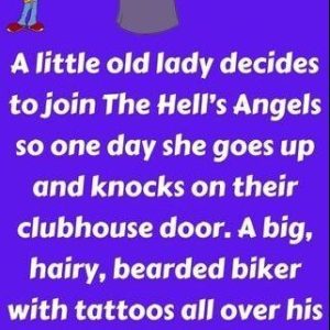 A little old lady decides to join The Hell’s Angels so one day she goes up and knocks on their clubhouse door. A big, hairy, bearded biker…