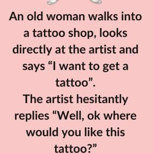 An old woman walks into a tattoo shop, looks directly at the artist and says “I want to get a tattoo”. The artist hesitantly replies “Well, ok…