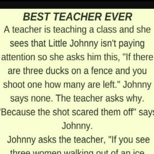 A teacher is teaching a class and she sees that Johnny isn’t paying attention, so she asks him, “If there are three ducks sitting on a fence,…