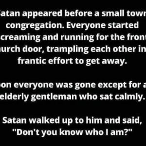Satan appeared before a small town congregation. Everyone started screaming and running for the front church door, trampling each other in a frantic effort to get away….