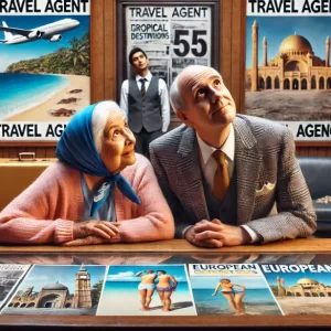 A travel agent looked up from his desk and saw an older lady and an older gentleman peering into the shop window, where there were posters of…