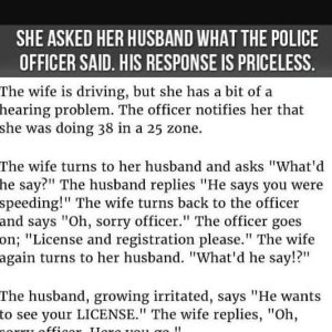 The wife is driving, but she has a bit of a hearing problem. The officer notifies her that she was doing 38 in a 25 zone. The…