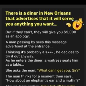 There is a diner in New Orleans that advertises that it will serve you anything you want…but if they can’t, they will give you $5,000 as an…