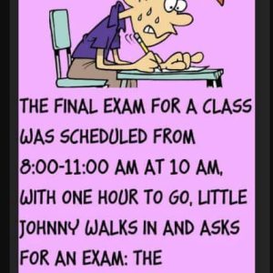 The final exam for a class was scheduled from 8:00-11:00 AM At 10 AM, with one hour to go, Little Johnny walks in and asks for an…
