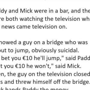 Paddy and Mick were in a bar, and they were both watching the television when the news came television on. It showed a guy on a bridge…