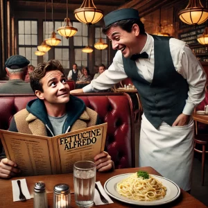 A man goes into a restaurant. He has a seat at a booth and opens a menu to find out that none of the foods have prices…