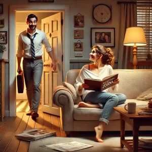 A man comes home one night to find his blonde wife reading his personal journal