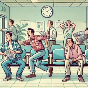 Four expectant fathers pace back and forth in a hospital waiting room while their wives are in labor