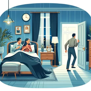 A woman was with her boyfriend in her bedroom when she heard her husband coming up the front door. In a panic she told her boyfriend “Hurry,…