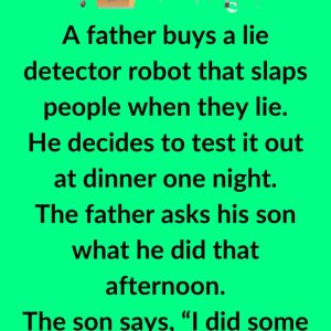A father buys a lie detector robot that slaps people when they lie.He decides to test it out at dinner one night. The father asks his son…