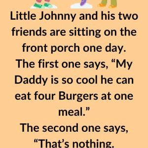 Little Johnny and his two friends are sitting on the front porch one day.The first one says, “My Daddy is so cool he can eat four Burgers…