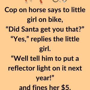 Cop on horse says to little girl on bike,“Did Santa get you that?” “Yes,” replies the little girl.“Well tell him to put a reflector light on it…
