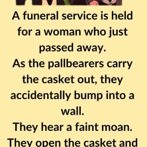 A funeral service is held for a woman who just passed away.As the pallbearers carry the casket out, they accidentally bump into a wall. They hear a…