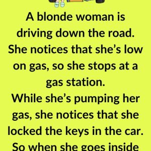 A blonde woman is driving down the road.She notices that she’s low on gas, so she stops at a gas station. While she’s pumping her gas, she…