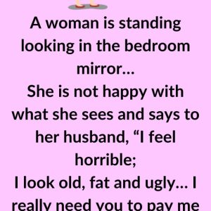 A woman is standing looking in the bedroom mirror… She is not happy with what she sees and says to her husband, “I feel horrible; I look…