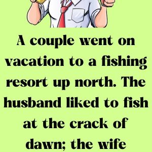 A couple went on vacation to a fishing resort up north. The husband liked to fish at the crack of dawn; the wife preferred to read. One…