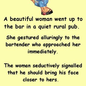 A beautiful woman went up to the bar in a quiet rural pub She gestured alluringly to the bartender who approached her immediately. The woman seductively signalled…