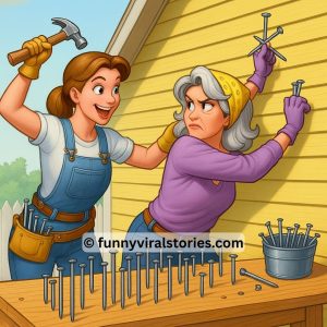 Two lady were working on a house. One of them was nailing down siding. She’d reach into her nail pouch, pull out a nail, and either hammer…