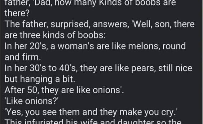 A family is at the dinner table. The son asks his father, ‘Dad, how many Kinds of boobs are there? The father, surprised, answers, ‘Well, son, there are three kinds of boobs: In her 20’s, a woman’s are like melons, round and firm.