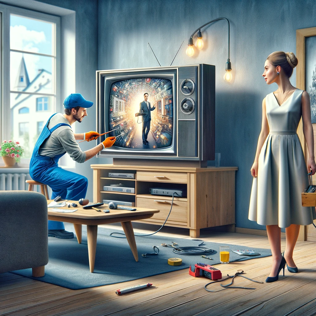 The housewife was having her TV repaired. The TV repairman couldn’t keep his eyes off of her. Every time she came in the room, he’d nearly about jerk his neck right out of joint looking at her: When he’d finished she paid him and said.