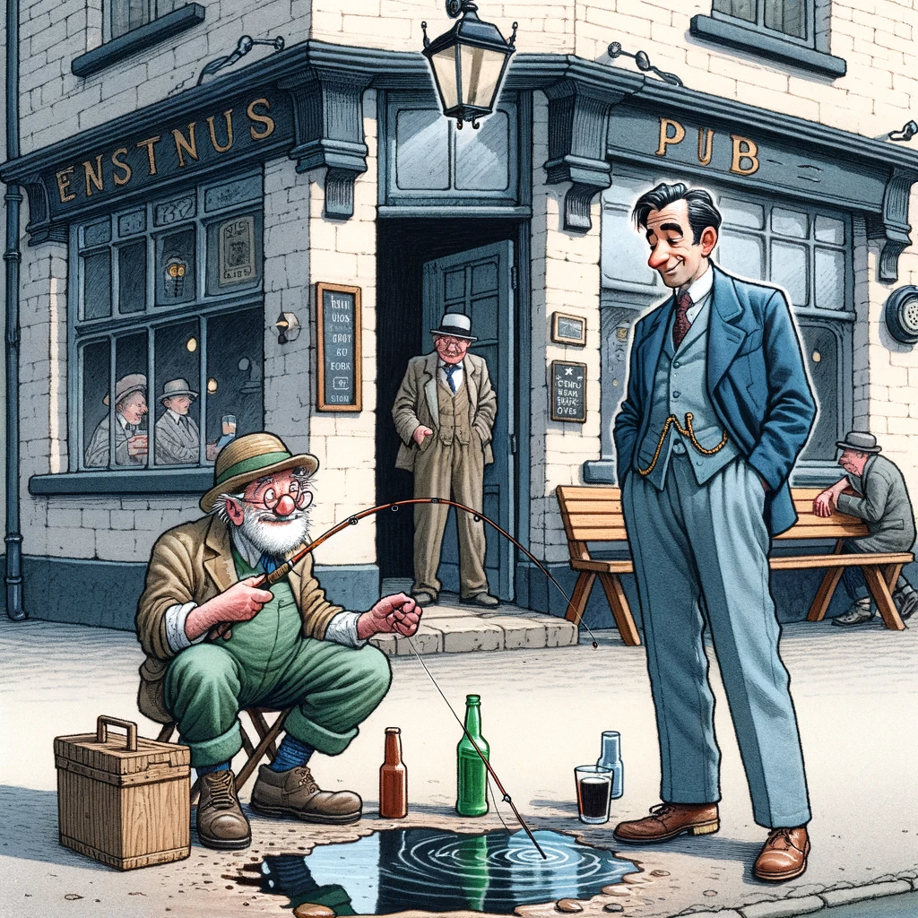 The well-dressed gentleman watched an old man fish in a puddle outside a pub.
